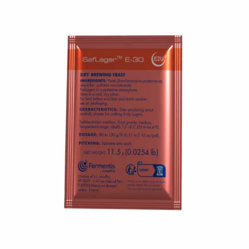 Skriv en recension, klicka HÄR!E-30 är en lagerjäst för mer aromatiska och fruktiga typer av lageröl. E-30 producerar höga nivåer av estrar för att vara en lagerjäst. Högre jäsningstemperaturer ger subtila smaker av skumbanan.