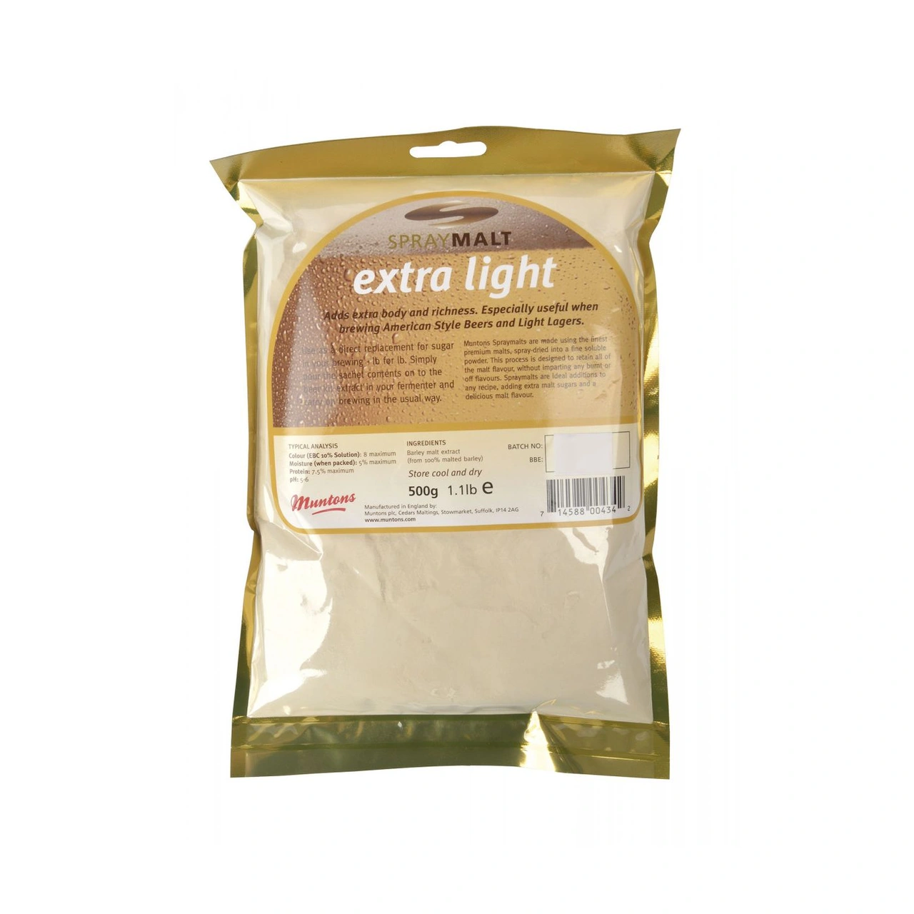 Muntons spraymalt extra light ger extra fyllighet och kropp. Särskilt användbart vid bryggning av lättare öl som lager och pilsner.